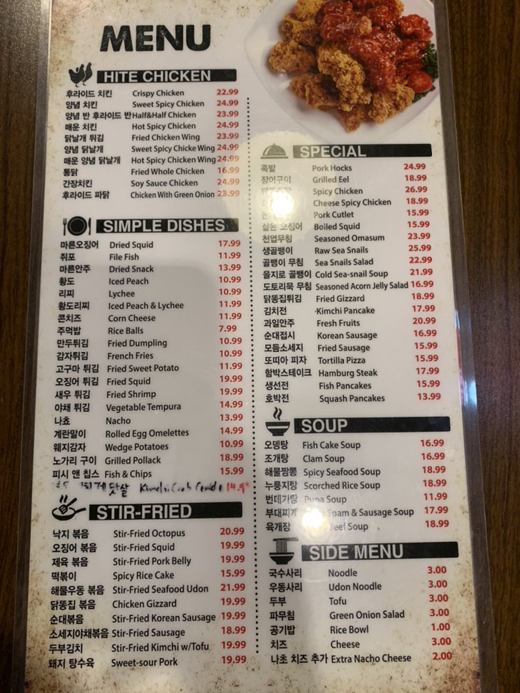 Introducing the menu at Hite Kwang-Jang, a popular spot in Koreatown, Los Angeles, known for its delicious Korean chicken wings. The restaurant offers a variety of dishes, including deep-fried chicken wings, fried chicken gizzard, and flavorful pan-broiled octopus and squid. Customers rave about the tasty food and great service, making it a go-to place for a casual night out with friends. Reviews highlight favorites like the tong dak, sweet potato fries, odeng tang, and new corn ribs. The relaxed ambiance, ample space, and numerous TVs make it perfect for watching games while enjoying good food and drinks. Overall, Hite Kwang-Jang is a top choice for a fun night out in K-Town, offering a wide range of menu options and a vibrant atmosphere.
